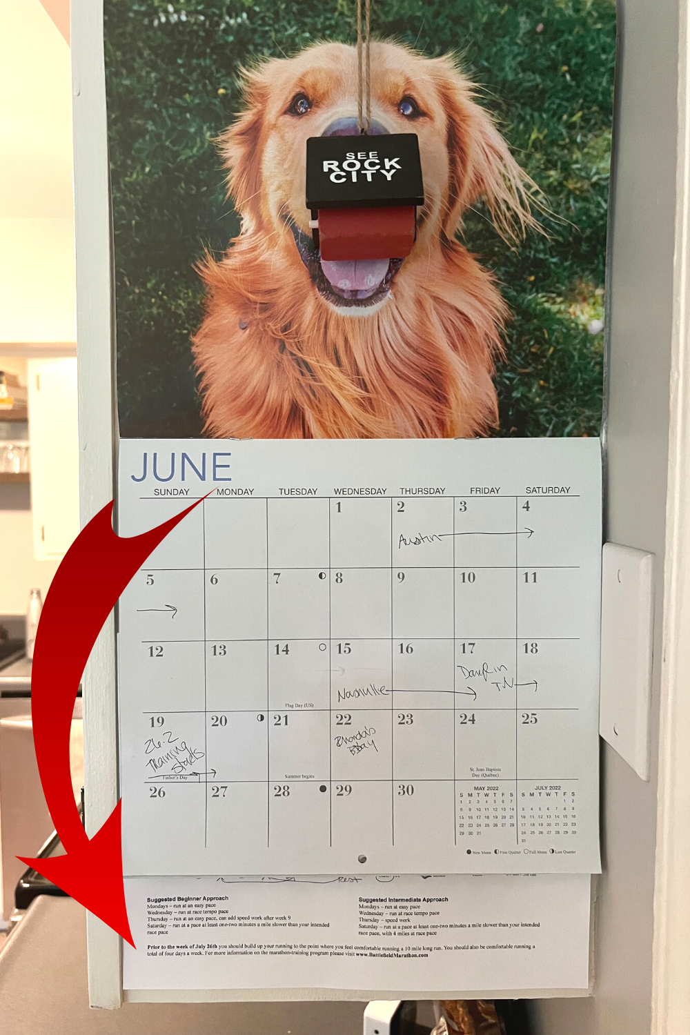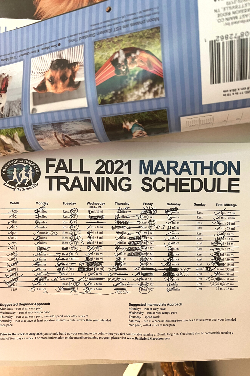 If you look left when walking through the door between my kitchen and dining room, you will see a paper peeking out below my hanging wall calendar on the side of the cabinet. This is where my first marathon training plan lives. If you lift up the calendar you will see the total scratched up mess it turned out to be.